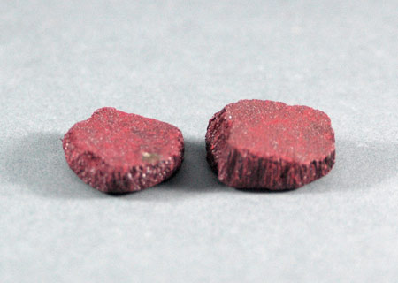 朱砂是硫化汞的天然矿石,属三方晶系。晶体成厚板状或菱面体,在自然界中单体少见,多呈粒状、致密状块体出现,也有呈粉末状被膜者。颜色为朱红色至黑红色,有时带铅灰色。条痕为红色。金刚光泽,半透明。有平行的完全解理。断口呈半贝壳状或参差状。硬度2-2.5。比重8.09-8.2。性脆。